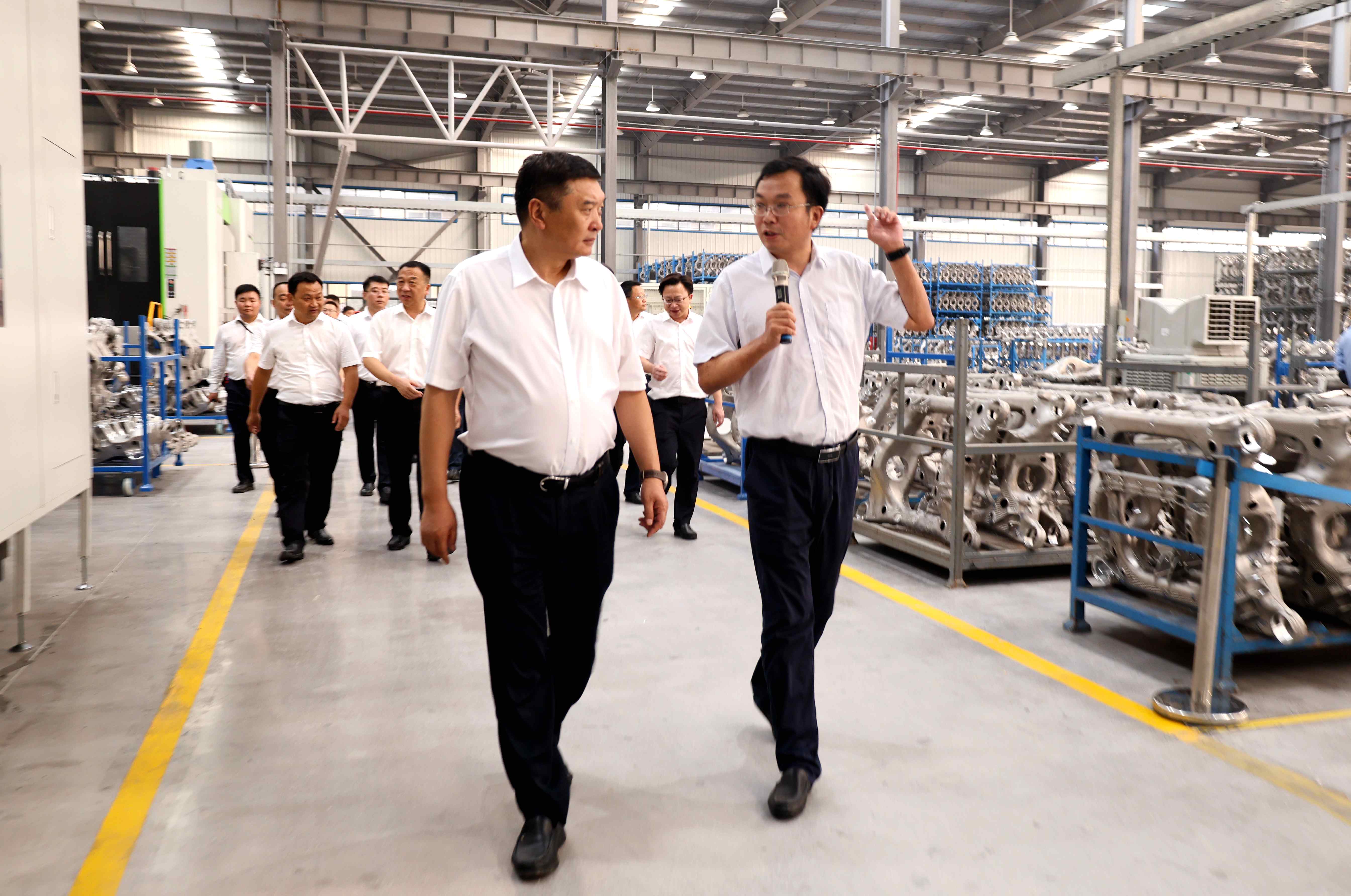 區(qū)政府包聯(lián)航特裝備單位負(fù)責(zé)人--掇刀區(qū)發(fā)改局局長王鵬程就航特新能源汽車輕量化副車架精密加工項目總體情況、產(chǎn)能規(guī)劃等內(nèi)容作了詳細(xì)的說明。在精密加工車間內(nèi),公司副總經(jīng)理熊小平向周俊杰及參加活動的各級領(lǐng)導(dǎo)介紹了項目建設(shè)情況、設(shè)備運行情況及當(dāng)前市場形勢。周俊杰回顧了該項目從立項到實施建設(shè)的全部過程。